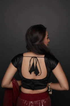 The Black Velvet Sweetheart Neck Tie  brings elegance and comfort in a versatile style.  It comes with a beautiful sweetheart neckline and adjustable tie back enclosure for the perfect fit. The blouse is velvet and fully lined. The ultimate go to black saree blouse!