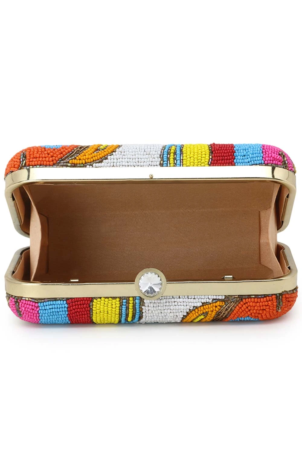 Be the star of the evening with this pretty clutch. Designed in gold & multi color with durable faux silk & this clutch adds just the right amount of glamour to make you feel bold and confident about your attire. The design and chain is really sturdy too so you will never be afraid of it breaking apart. Secured with a click closure & you will find this clutch quite spacious to hold a phone & makeup and a wallet.