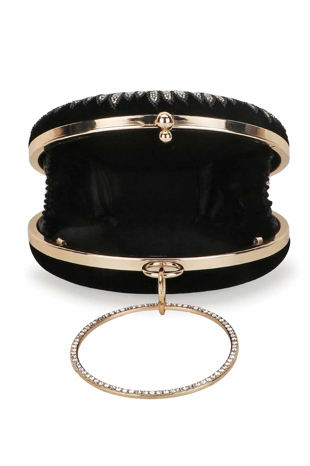 This Black & Gold Circle Clutch comes with a spacious main compartment secured with a Click closure. It features a Floral Embroidered Pattern on Satin fabric and comes with a Detachable Shoulder strap along with a wrist loop.