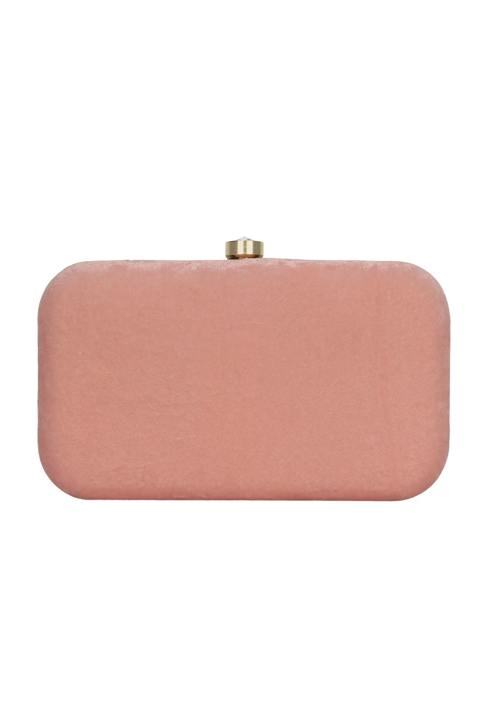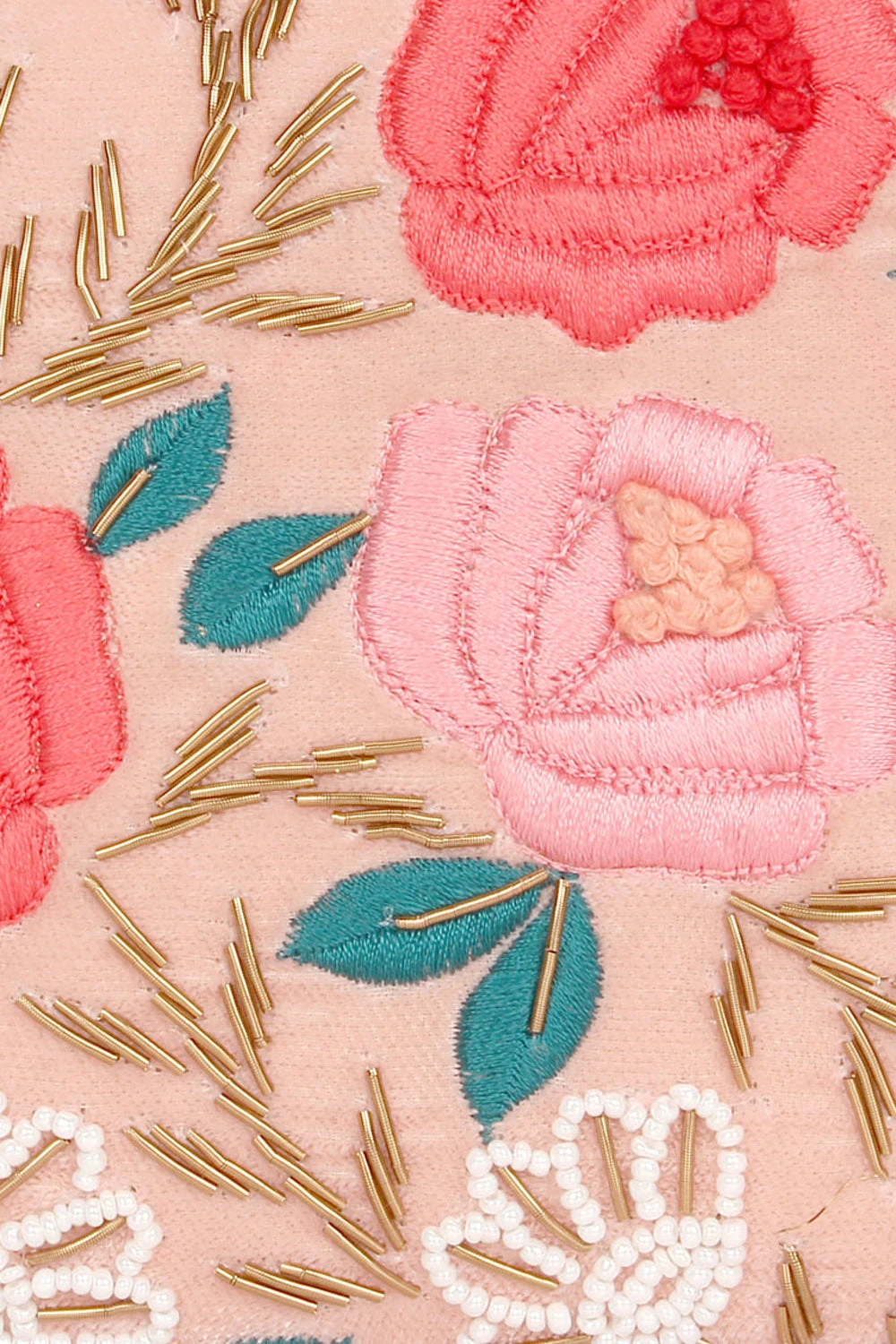 This peach hand-crafted faux silk box clutch with multicolor floral embroidered work has one main compartment with clasp closure and a detachable metal chain. Can also be used as a sling bag.
