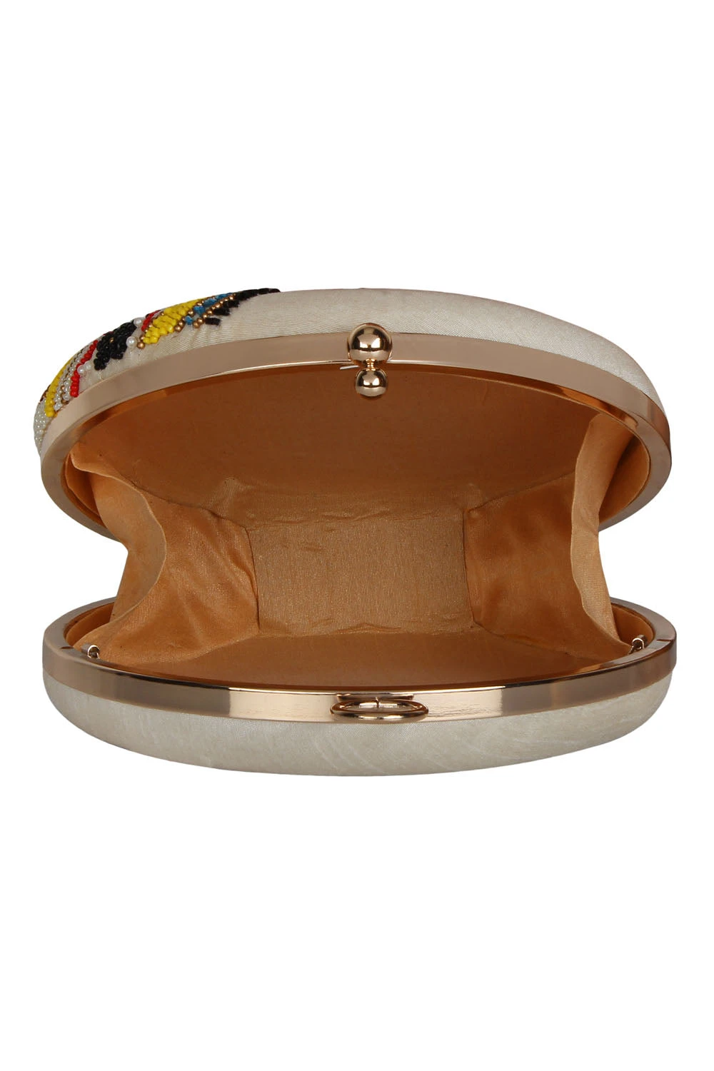 This designer Artwork White hand-crafted round clutch has a beautiful multicolored Kathak based embroidered design. It has one main compartment with clasp closure and a detachable metal chain. Can also be used as a sling bag.