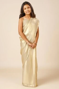 The epitome of minimalist luster in a saree, the Deva Champagne Gold Silk One Minute Saree for Kids & Tweens is perfect for a bridesmaid look or as a must have staple for your wardrobe. It comes with an optional belt and matching blouse in the material seen in the picture.