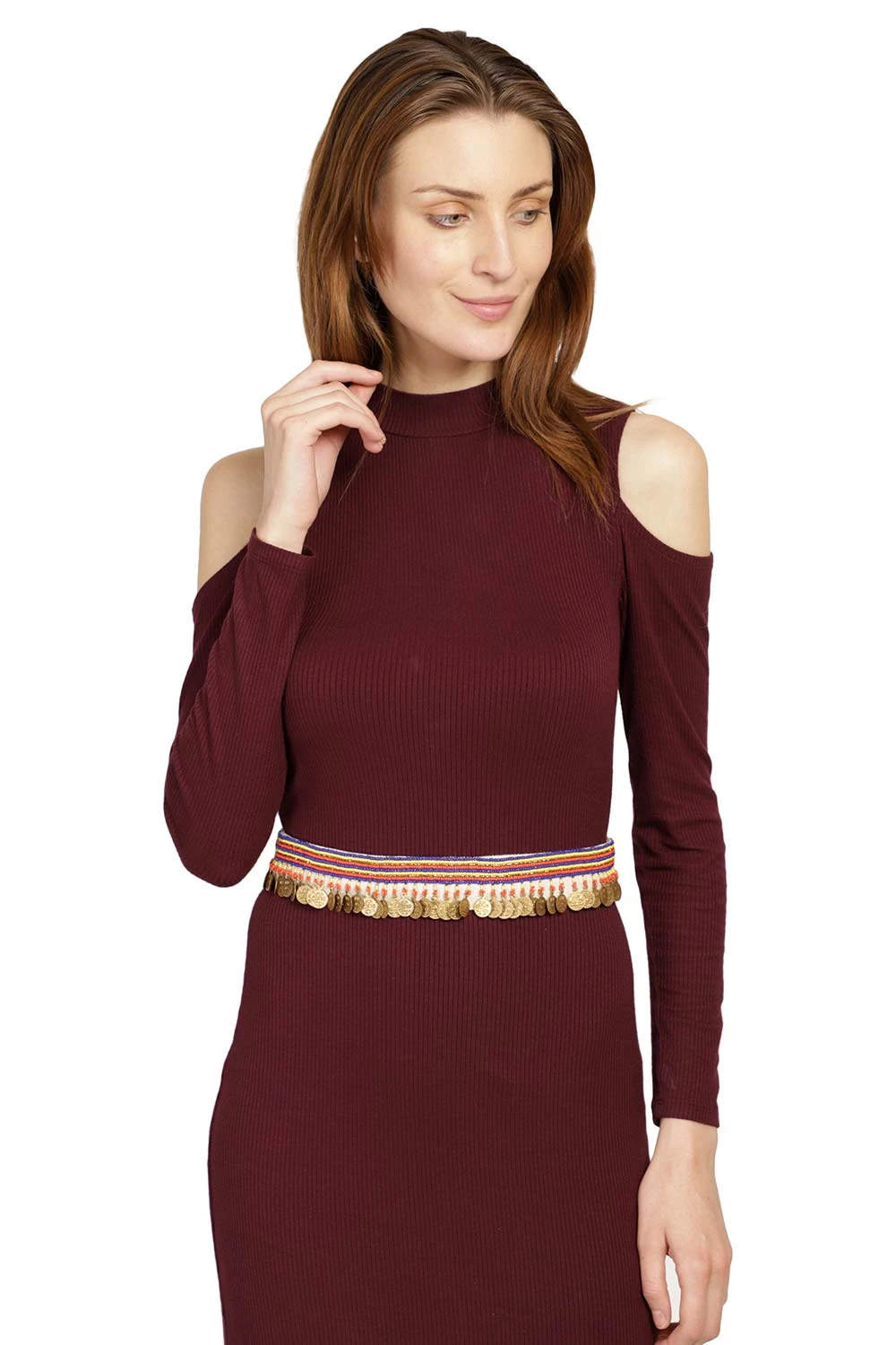 Natural & multi canvas belt with beads and coins embellished work. It has a snap button closure. Stretchable, can easily be fitted around your waist. Glam up any of your outfits by adding this to your collection.