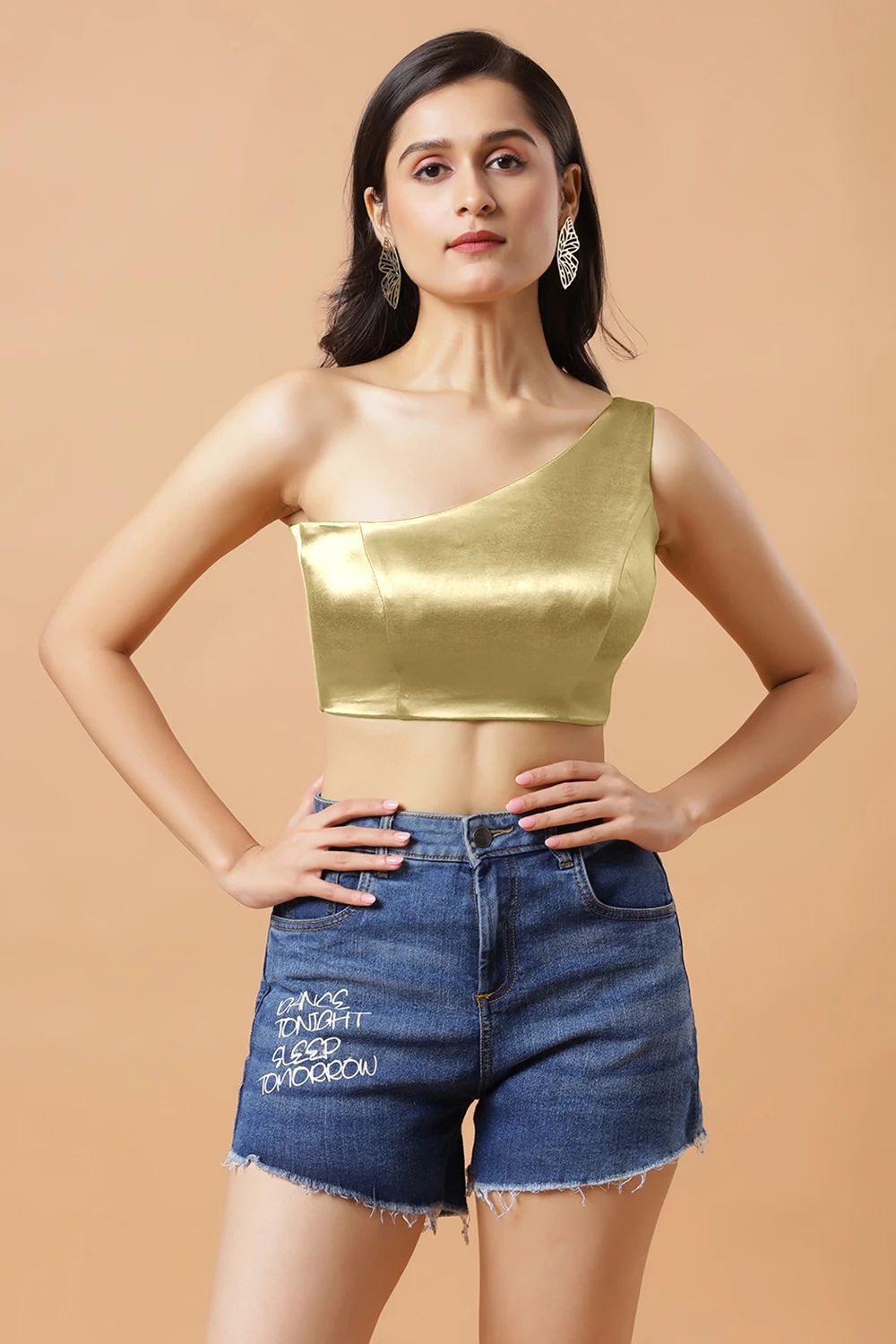The Giana Light Gold One Shoulder Blouse takes traditional elegance to the next level! The blouse is a true Black color in a one shoulder style with the right shoulder exposed. It is made of durable and comfortable stretchable Satin / Cotton with Cotton lining. It has a side zipper enclosure and optional padding.
