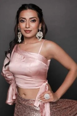 Fiesta time! Featuring this Rose Gold Satin Blouse made with a soft Satin Fabric. Asymmetric puff sleeve design with a waist tie –  Pair with a saree or any bottom.
