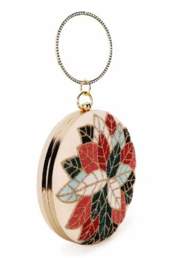 Designer Round Clutch In Cream Silk With Mirror Work & Multi-color Embroidery